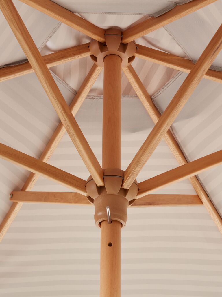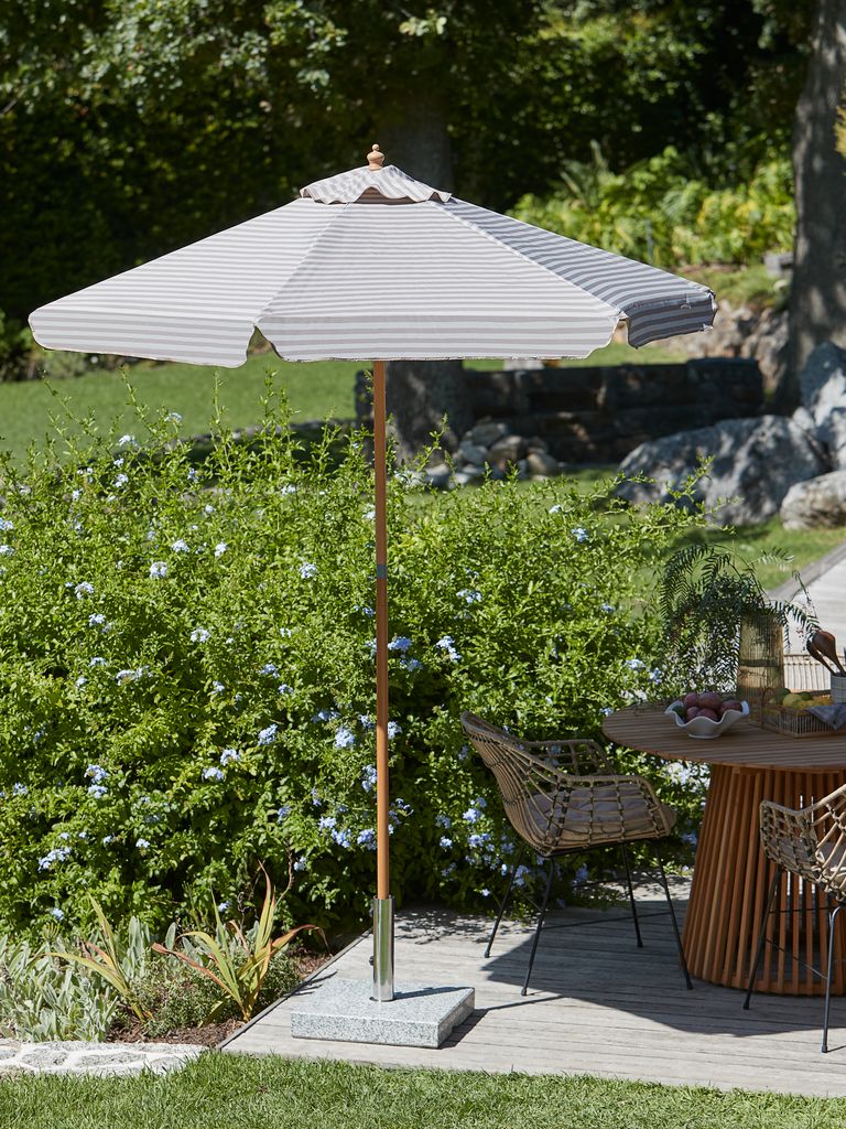 Relaxează-te la umbră cu umbrela de soare IBSTED. Dispunând de calotă impermeabilă cu protecție UV, spații de ventilare și picior din aluminiu cu aspect de lemn, această umbrelă de soare în dungi este potrivită pentru aproape orice spațiu exterior. Ø200x233 cm