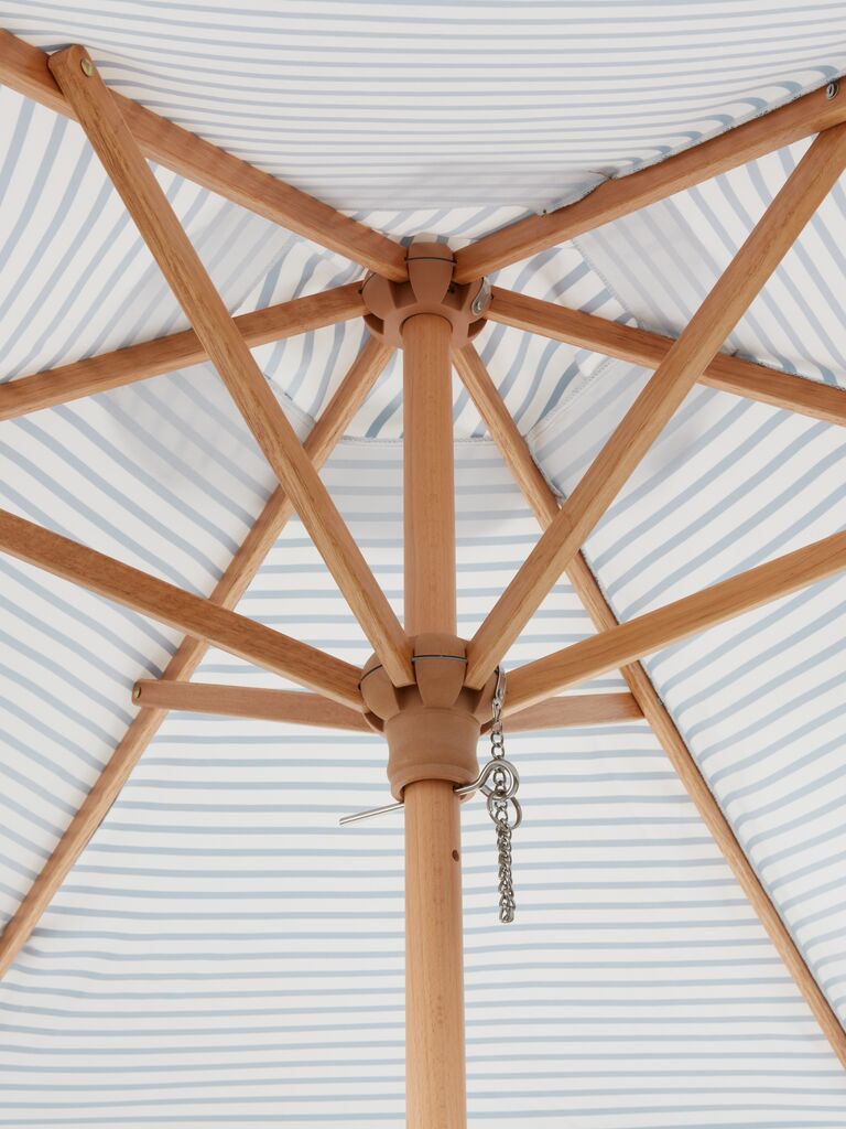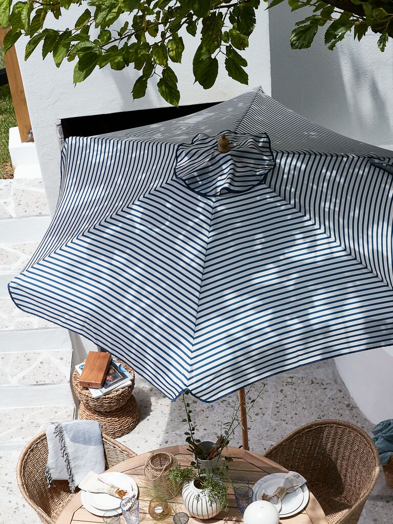 Relaxează-te la umbră cu umbrela de soare IBSTED. Dispunând de calotă impermeabilă cu protecție UV, spații de ventilare și picior din aluminiu cu aspect de lemn, această umbrelă de soare în dungi este potrivită pentru aproape orice spațiu exterior. Ø200x233 cm
