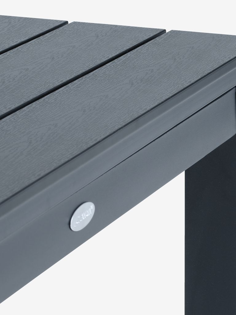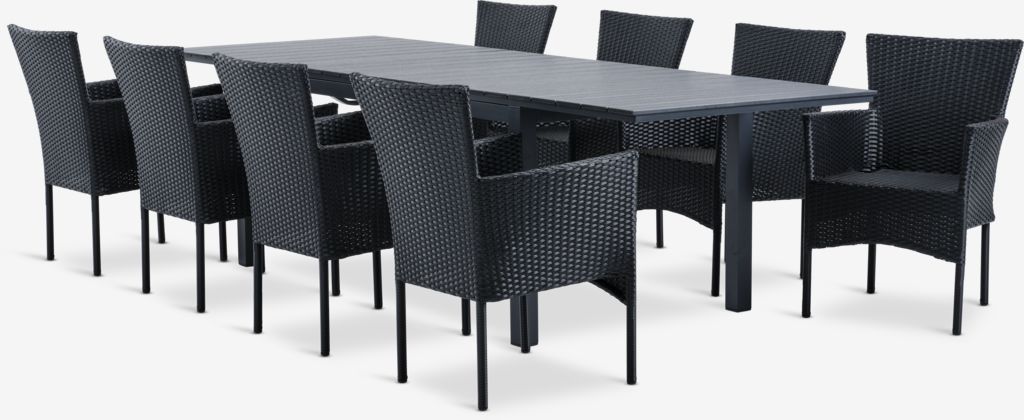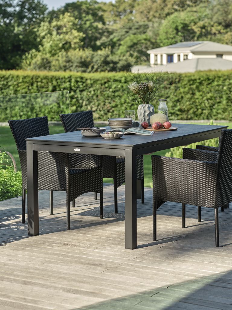 Set de grădină cu 4 locuri. Masă: Aluminiu și lemn artificial. Incl. 2 extensii, care pot fi depozitate sub blat. 95x206/319x76 cm Scaun: Oțel și poliratan. Stivuibil.