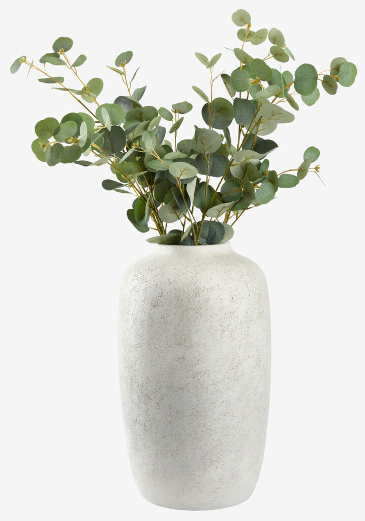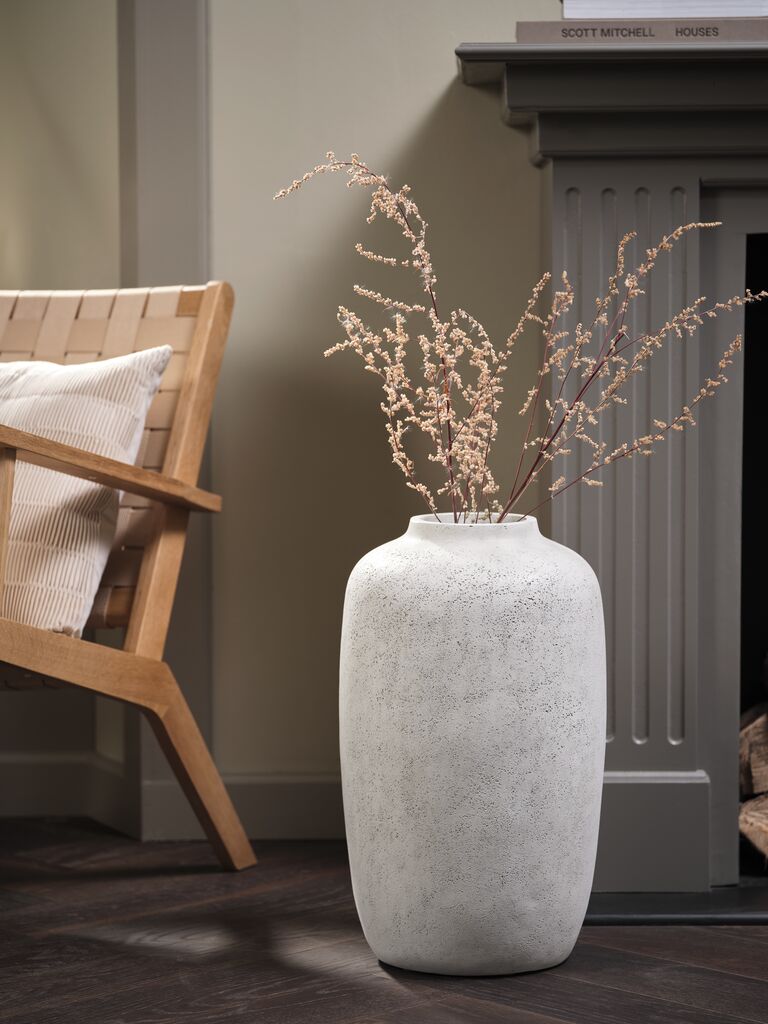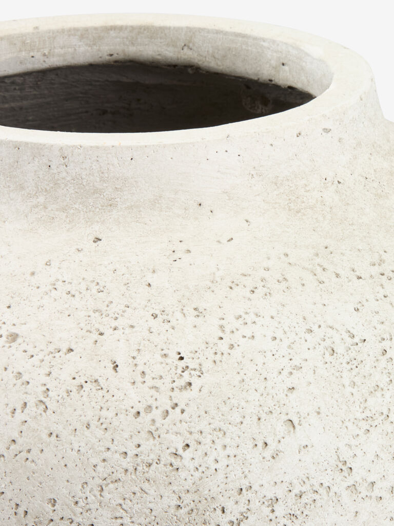 Vază din fibră de argilă gri deschis, cu finisaj brut, texturat. Designul mare și simplu o face ideală pentru expunerea buchetelor mari sau a crengilor. Ø30x51 cm
