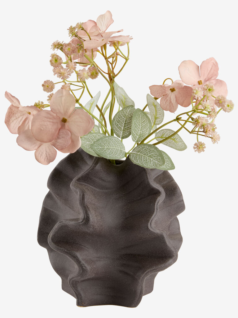 Vază din ceramică maro închis, cu o formă sculpturală, organică și o suprafață texturată. Este potrivită pentru a expune flori sau poate sta singură ca obiect decorativ. l19 x L17 x H18 cm