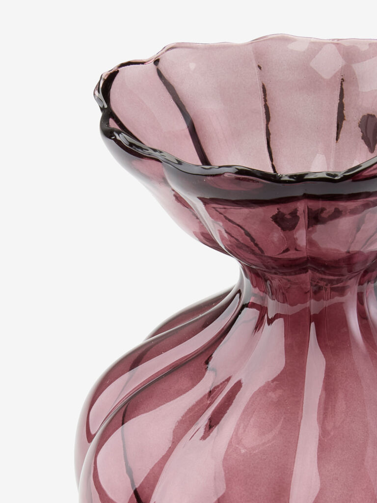 Vază din sticlă de culoare violet, cu design sculptural, canelat. Forma organică este potrivită pentru expunerea florilor sau poate fi folosită ca obiect decorativ de sine stătător. Ø19x30 cm