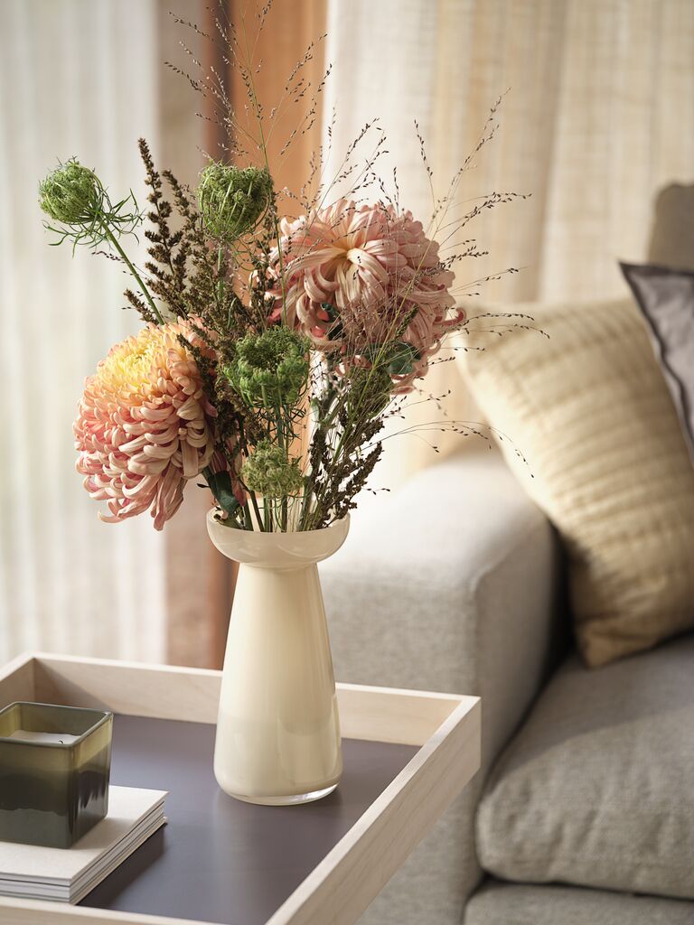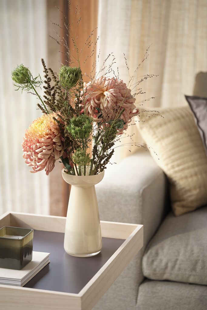 Vază din sticlă netedă, cu o formă modernă și o culoare caldă de vanilie. Designul său sculptural o face ideală pentru a expune buchete sau pentru a fi folosită ca obiect decorativ de sine stătător. Ø11 x H22 cm