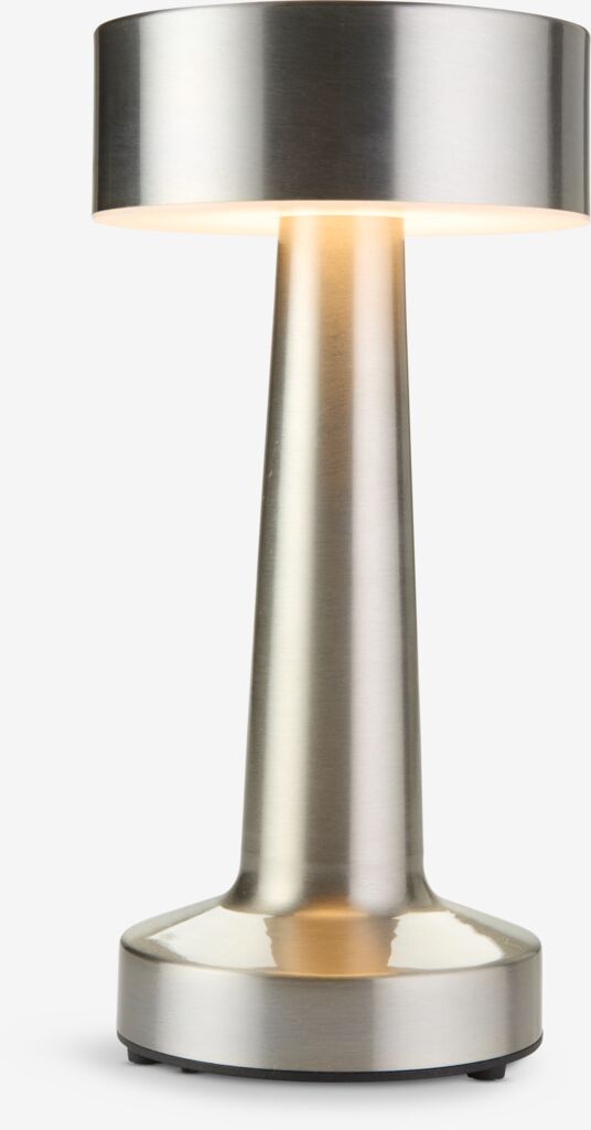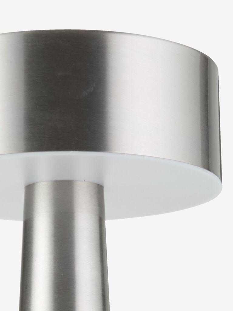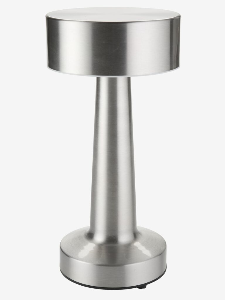 Veioză cu baterie, cu finisaj cromat modern. Designul său fără fir o face ușor de plasat oriunde, de la masa din grădină la balcon. Lampa are temporizator și se încarcă printr-un cablu USB-C. Ø11x21 cm