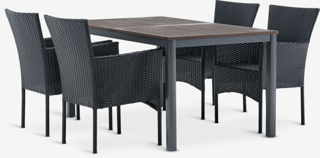 Set de grădină cu 4 locuri. Masă: Aluminiu și lemn de esență tare FSC®. 90x150x75 cm Scaun: Oțel și poliratan. Stivuibil.
