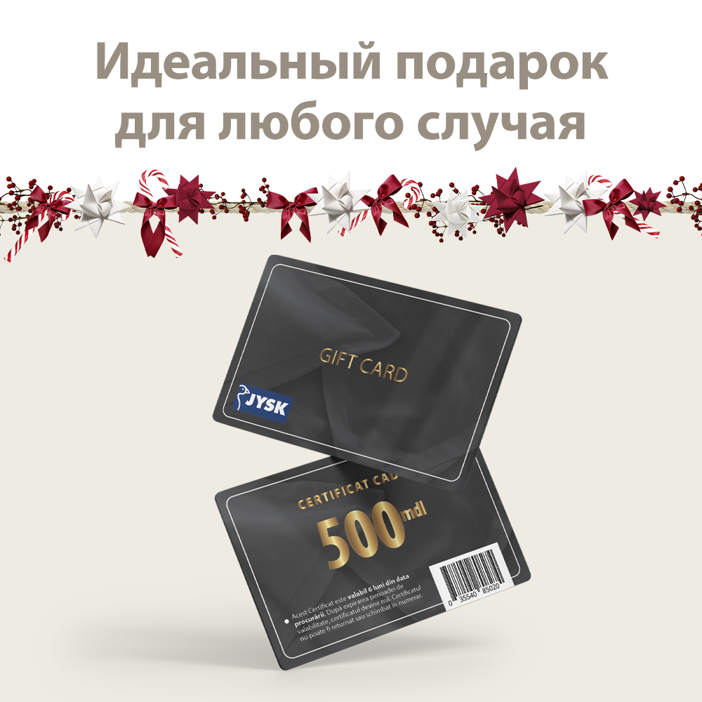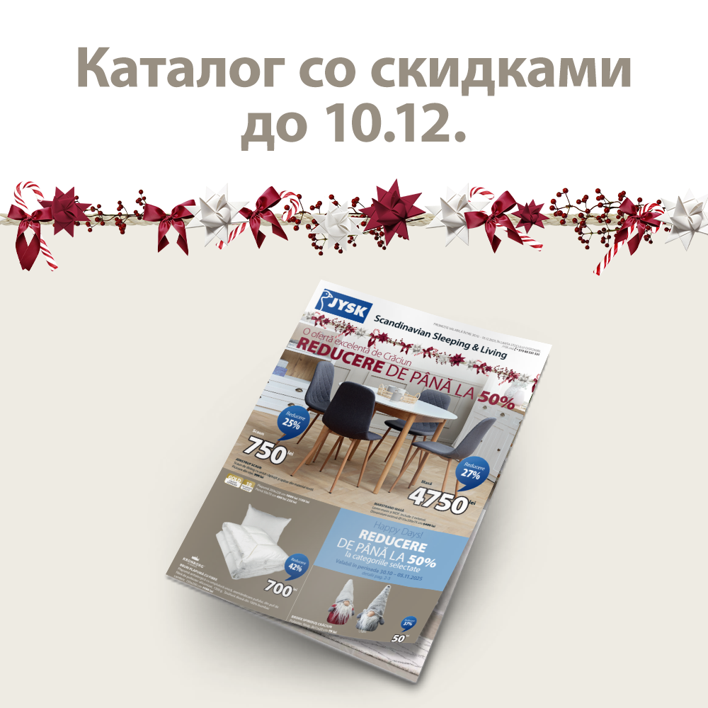 Да, я хотел бы подписаться на новостную рассылку от JYSK,содержащую вдохновляющие идеи, специальные предложения, новости и информацию о текущих акциях в рамках всего ассортимента JYSK Молдова. В то же время я соглашаюсь с Условиями и Положениями. Согласие может быть отозвано в любое время. JYSK обрабатывает персональные данные, чтобы отправлять вам новостную рассылку. Я принимаю Политику о сборе, обработке и защите персональных данных.