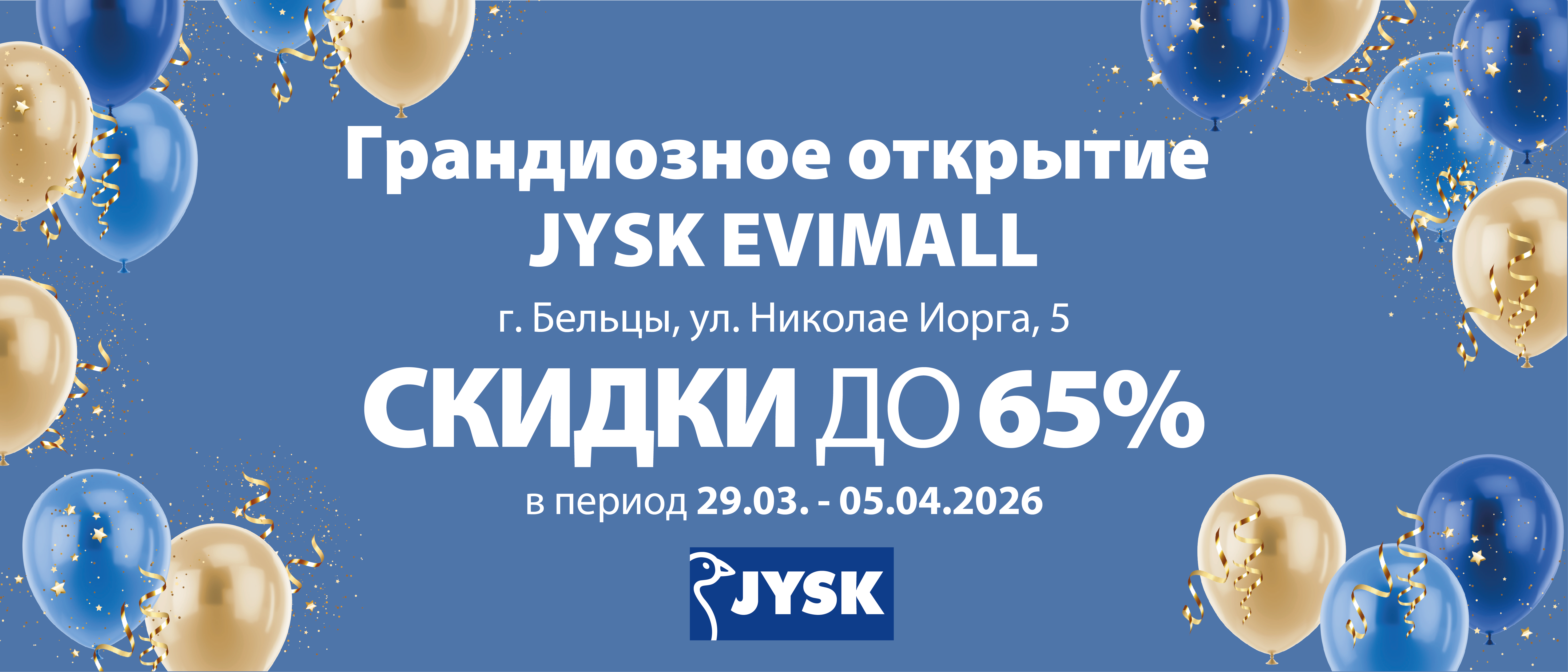 Ждем вас в воскресенье 29 марта, в 13:00 в магазине EVIMALL JYSK BĂLȚI, ул. Nicolae Iorga 5, чтобы отпраздновать открытия нового магазина JYSK в Бельцах. Кроме того, мы приглашаем вас насладиться замечательными подарками и невероятными предложениями по случаю открытия JYSK в Бельцах.