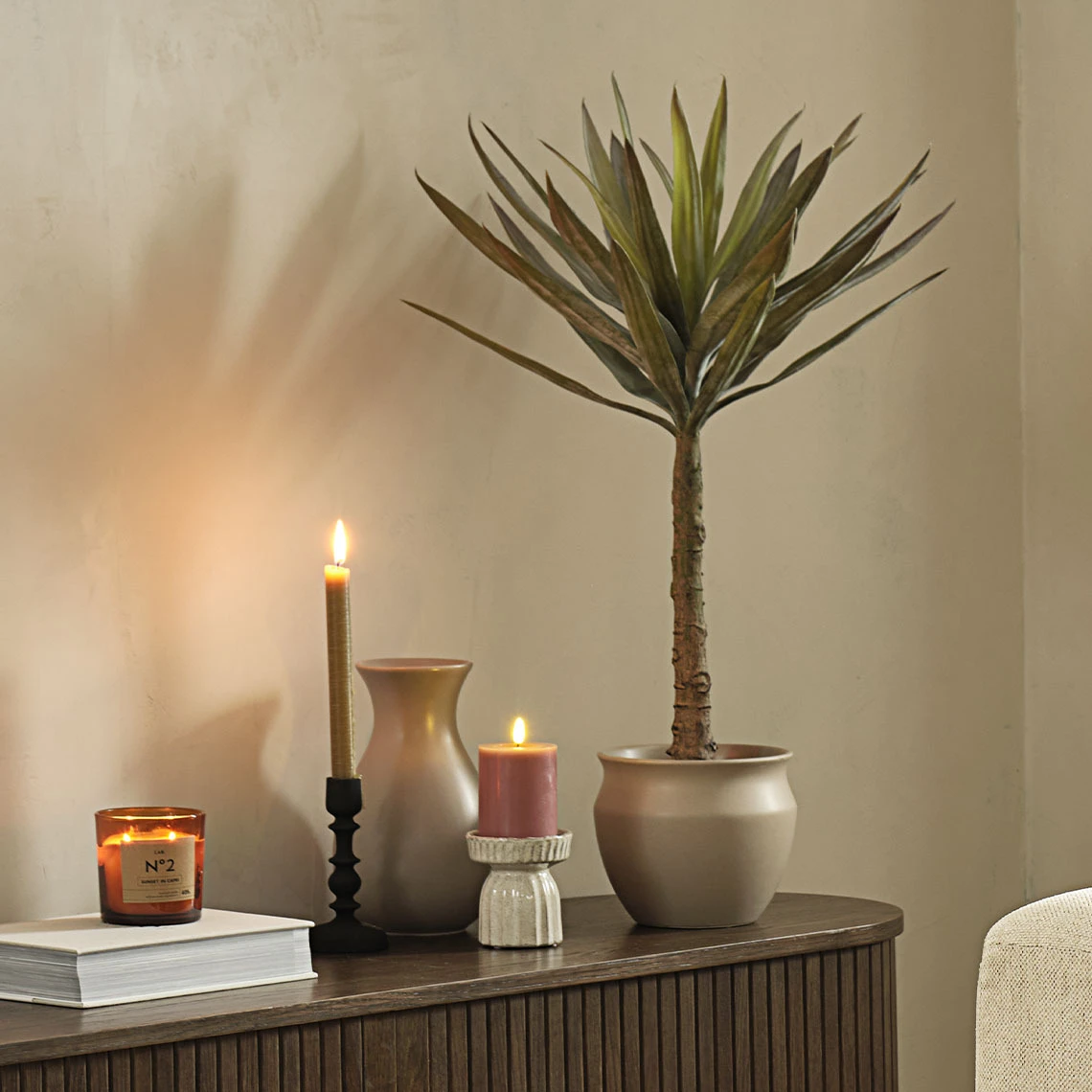 Кашпо HARALDUR выделяется сдержанным и элегантным дизайном. Мягко закруглённые формы и гладкая глазурованная поверхность придают современный шарм любому пространству. Искусственное растение ALAN высотой 90 см впечатляет своей реалистичностью. Припылённый зелёный оттенок листвы выглядит очень натурально и создаёт атмосферу уюта и гармонии. И главное - никакого полива и ухода!