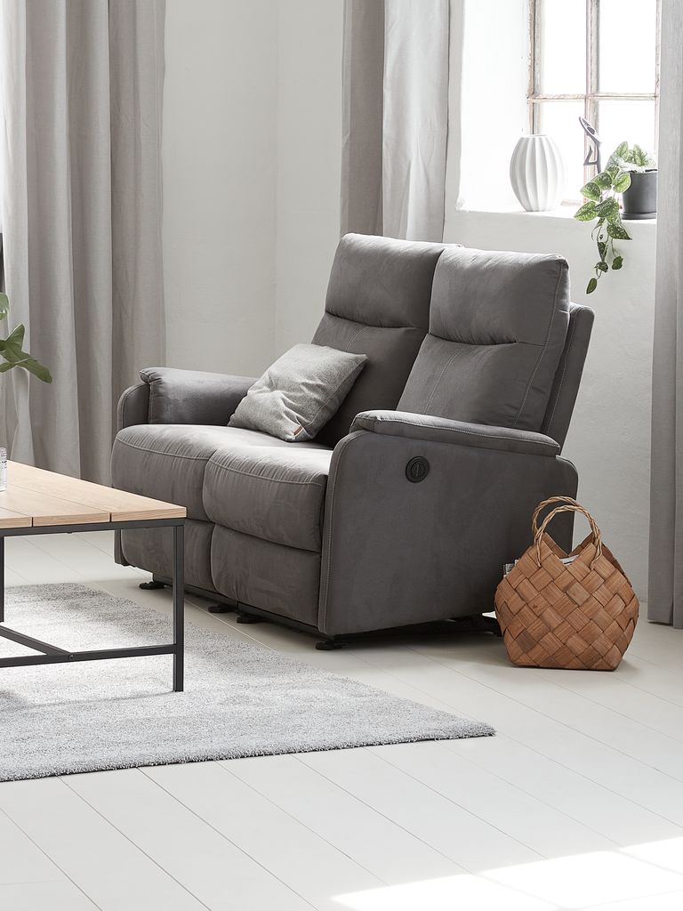 2-местный диван с тканевой обивкой. Наполнение подушек сиденья и спинки из пеноматериала. Электрический механизм плавного наклона спинки и встроенная подставка для ног. 138х90х83 см