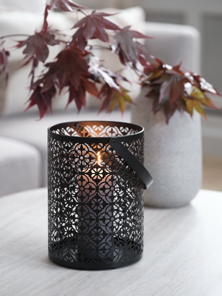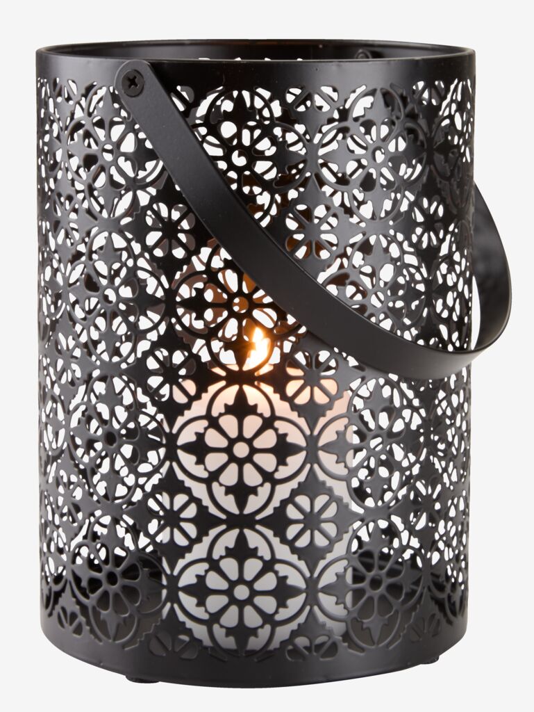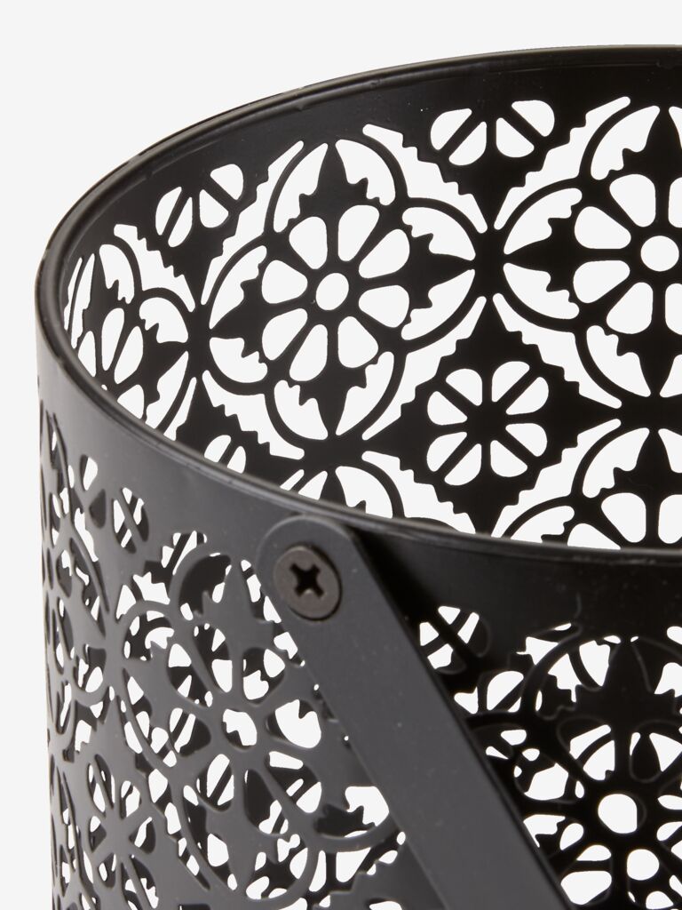Чёрный фонарь из стали с резными деталями, создающими красивую игру света. С ручкой. Ø15x20 см