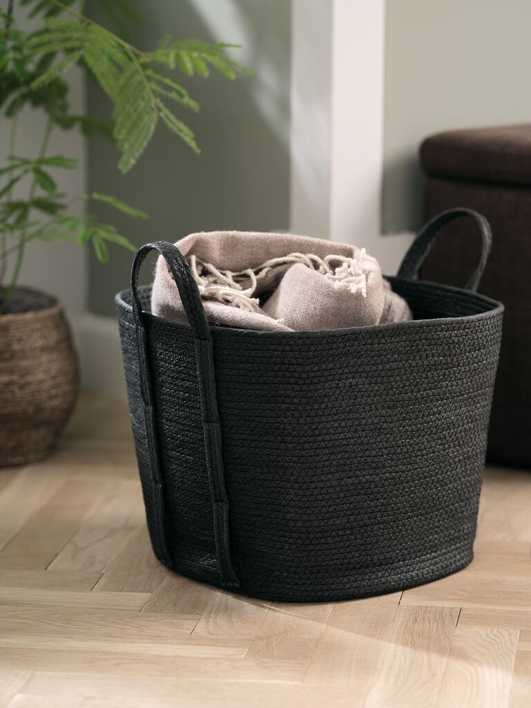 Чёрная корзина из бумажных нитей, идеально подходит для хранения пледов, игрушек и других предметов в гостиной или ванной комнате. Оснащена практичными ручками. 37x37x32 см