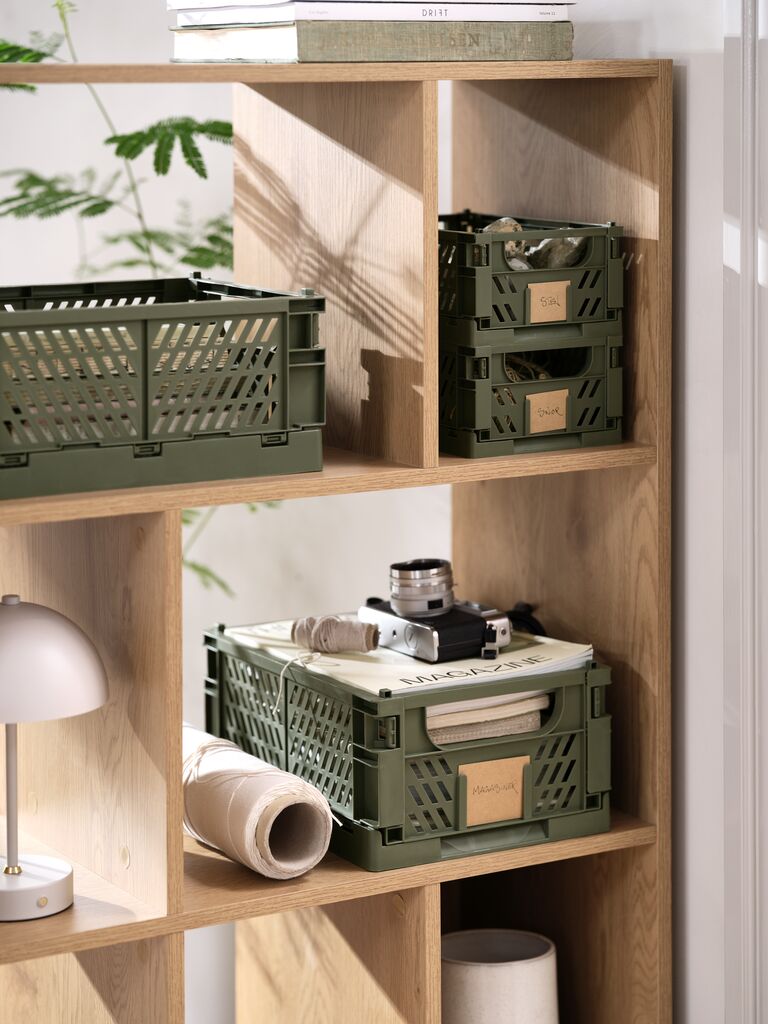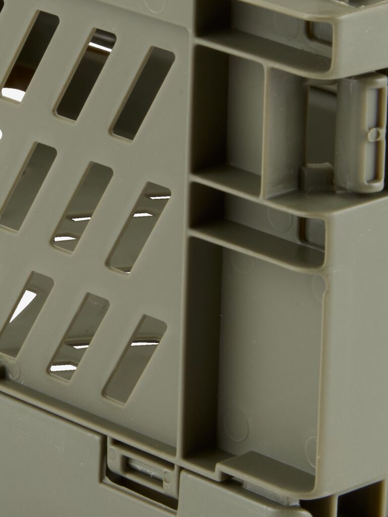 Складная корзина из пластика (100% переработанного) оливкового цвета. Идеальна для хранения канцелярских принадлежностей, хобби-материалов, аксессуаров и мелких предметов в ванной. Корзина штабелируемая, что экономит место. 25x34x15 см