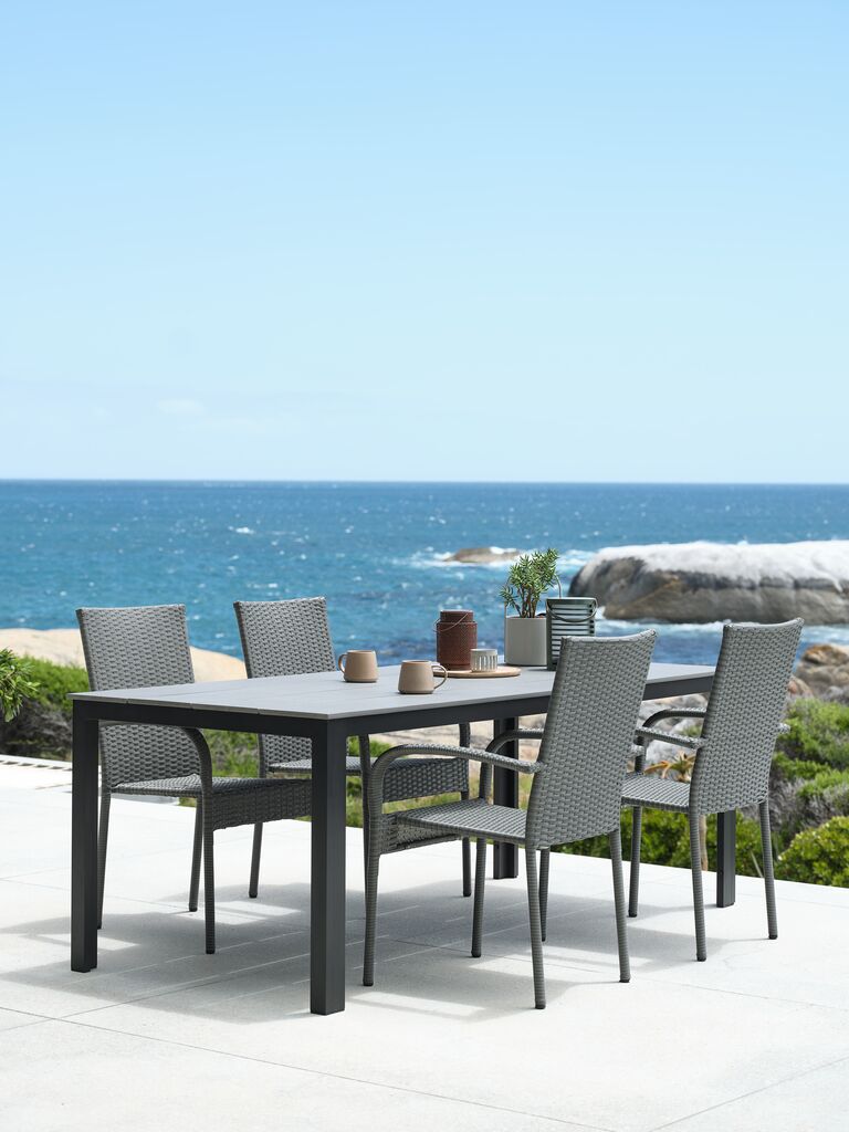 Садовый комплект на 4 персоны. Стол: алюминий и искусственное дерево. 90x205x74 см. Стул: сталь и полиротанг. Штабелируемый.