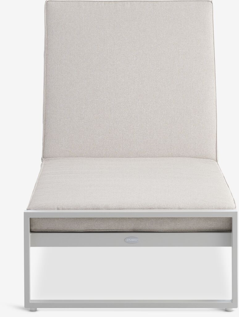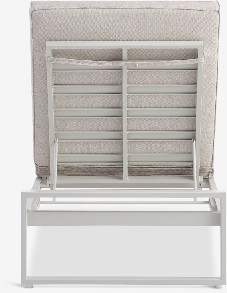 Алюминий, текстилен. Регулируемая спинка и подножка. В комплекте: подушки с внешним чехлом из прочного полиэстера. 70x89x107 см.